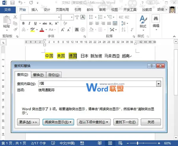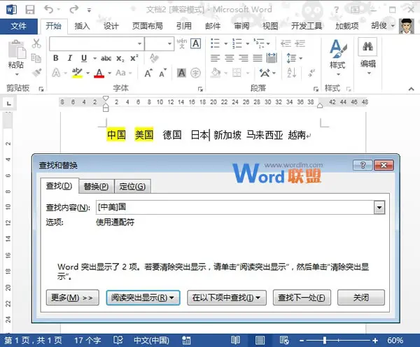 指定字符之一: “[]”框内的字符可以是指定要查找的字符之一,如:输入”[中美]国”就可以找到”中国”、”美国”。 又如:输入”th[iu]g”,就可查找到”thigh”和”thug”。 输入”[学硕博]士”,查找到的将会是学士、士、硕士、博士。