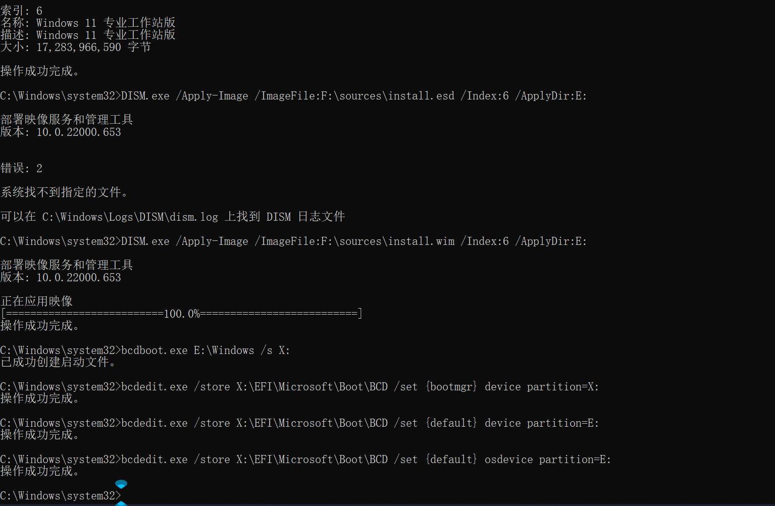 DISM.exe /Apply-Image /ImageFile:G:\sources\install.esd /Index:6 /ApplyDir:F: