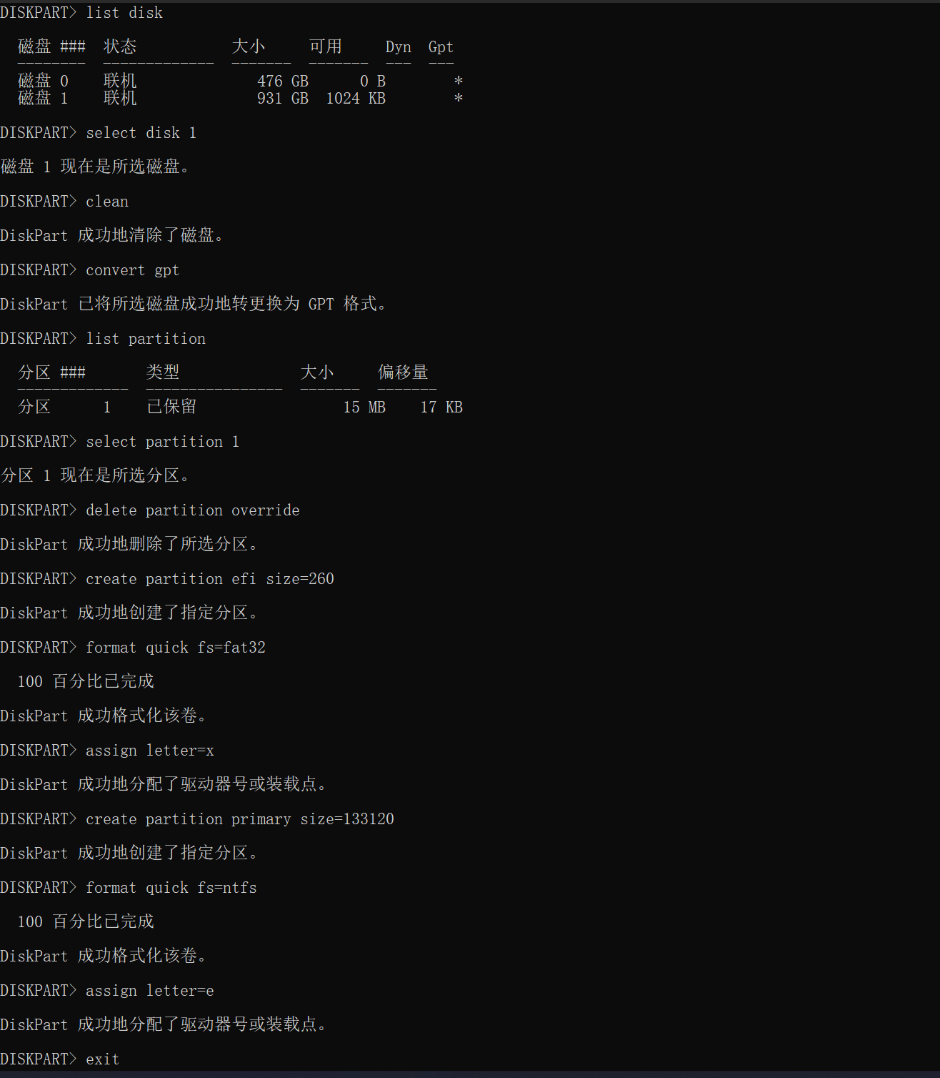 输入list partition,若没有出现错误,而是显示下图的信息,则执行以下命令: