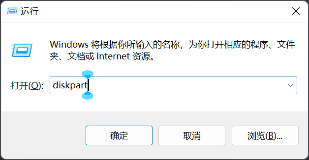 按Windows键+R键打开运行,输入diskpart回车,或者以管理员身份运行cmd,执行diskpart命令