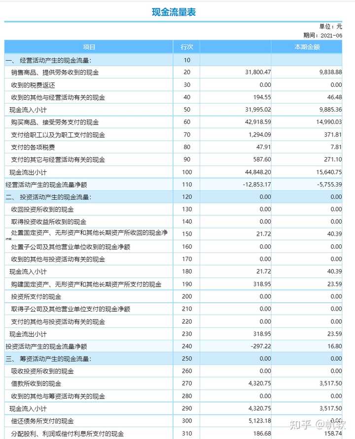现金流量表,主要是告诉我们,在一段时间里,这个公司收进了多少现金,付出去了多少现金,还余下多少现金在银行里。这张报表的关键也是要看这段时间有多长了,这一点同利益表或损益表一样。在这张表里,最重要的一个”勾稽关系”就是流入的现金减去流出的现金,等于余下的现金,这个关系也十分简单,就不用多解释了。